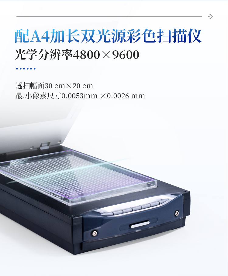 1、★配光学分辨率4800×9600、A4加长的双光源彩色扫描仪来成像。透扫幅面30 cm×20 cm,最小像素尺寸0.0053mm ×0.0026 mm。
